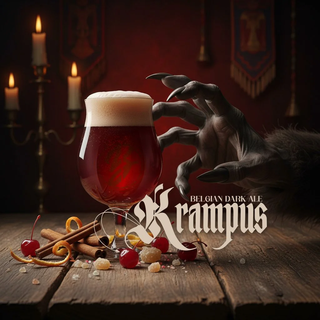 Krampus Belgian Dark Ale is a wicked winter sipper brewed with European malt and hops to deliver traditional Belgian character. Noble hops provide authenticity, while dark candi sugar imparts rich flavors of dried fruit. Lightly spiced with cinnamon, sweet orange peel, and crystallized ginger, it offers subtle notes of winter sweets. Yeast from a Belgian monastery and world-renowned cocktail cherries complete this delightfully naughty seasonal treat.